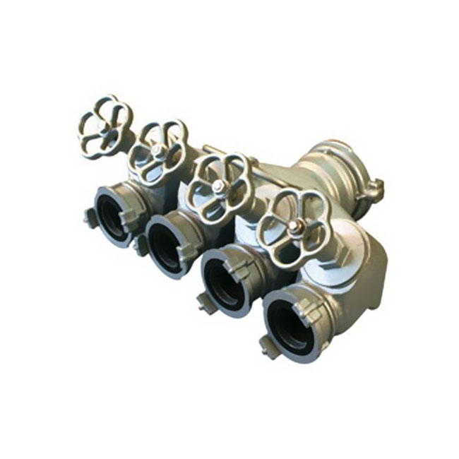 Category: Fire FightingThis is a fire breeching inlet with one inlet and four outlet connections for dividing the water flow into multiple hose lines. It is rated for a working pressure of 1.2 MPa and has overall dimensions of 430x550x315 mm.